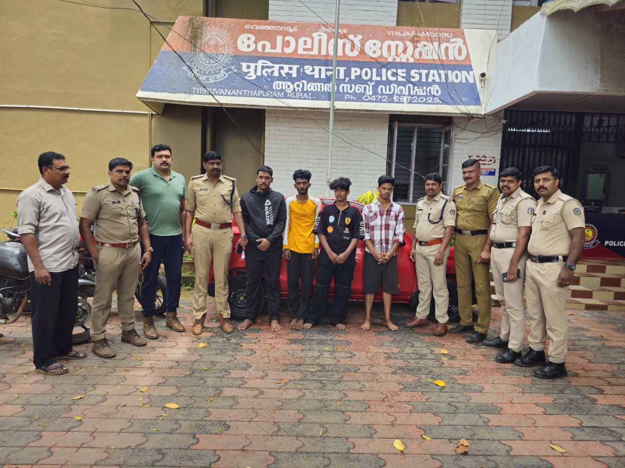 സുധീർ, മുഹമ്മദ് സൽമാൻ, ആഷിക്, സജിത്ത് എന്നിവരാണ് അറസ്റ്റിലായത്. പ്രതികൾ കൃത്യത്തിന് ഉപയോഗിച്ച ആൾട്ടോ കാർ പിടിച്ചെടുത്തു. ആറ്റിങ്ങൽ DYSP മഞ്ജുലാലിന്റെ നേതൃത്വത്തിൽ വെഞ്ഞാറമൂട് SHO ആസാദ് അബ്ദുൽകലാം, സബ്ബ് ഇൻസ്പെക്ടർമാരായ സജിത്ത്, ഷാൻ, രാജു, സി.പി. ഒമാരായ പ്രസാദ്, സന്തോഷ്, നജിംഷാ, മിഥുൻ എന്നിവർ അടങ്ങുന്ന സംഘമാണ് പ്രതികളെ കൃത്യം നടന്ന് ദിവസങ്ങൾക്കുള്ളിൽ വലയിലാക്കിയത്.