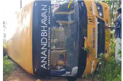 അഞ്ചല് ചൂരക്കുളത്തു പ്രവര്ത്തിക്കുന്ന ആനന്ദഭവന് സെന്റര് സ്കൂളിന്റെ ബസാണ് അപകടത്തില്പ്പെട്ടത്. റോഡിന്റെ വശത്ത് ഇട്ടിരുന്ന വലിയ മരക്കുറ്റിയില് തട്ടി ബസ് മറിയുകയായിരുന്നു.