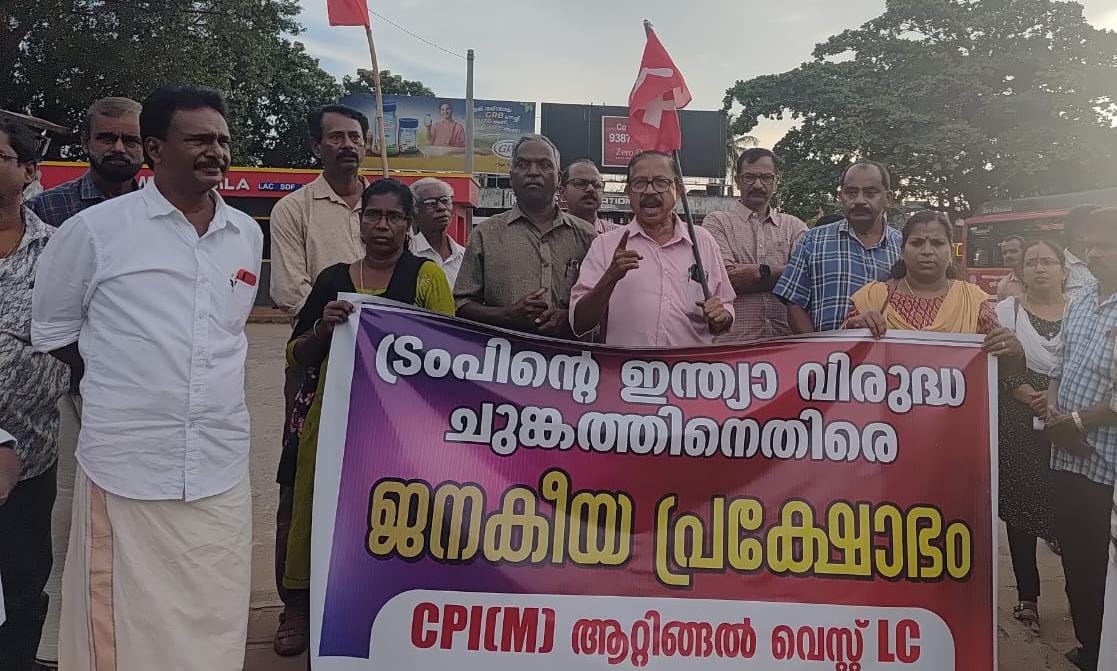 ഇന്ത്യൻ ഉൽപ്പന്നങ്ങളുടെ ഇറക്കുമതി തീരുവ 25 ശതമാനത്തിൽ നിന്ന് 50 ആക്കി ഉയര്‍ത്തിയ അമേരിക്കൻ പ്രസിഡന്റ് ഡൊണൾഡ് ട്രംപിന്റെ നടപടിയിൽ സി.പി.ഐ.എം ആറ്റിങ്ങൽ ഏരിയ യിലെ വിവിധ ലോക്കല്‍ കമ്മിറ്റികളുടെ നേതൃത്വത്തിൽ പ്രതിഷേധ പ്രകടനവും യോഗവും നടത്തി.