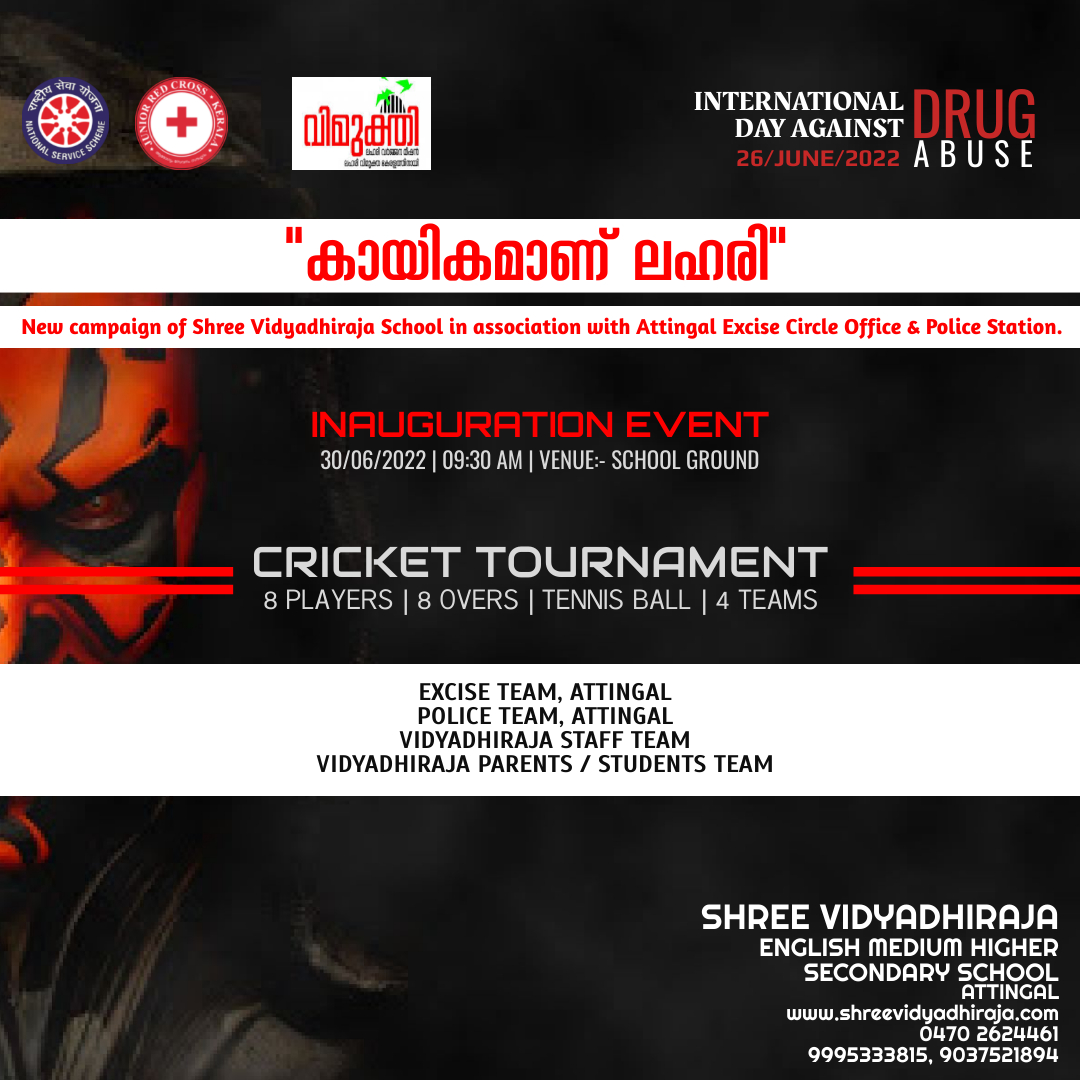 ആറ്റിങ്ങൽ: ആറ്റിങ്ങൽ എക്സൈസ് സർക്കിൾ ഓഫീസിന്റെയും പോലീസ് സ്റ്റേഷന്റെയും അഭിമുഖ്യത്തിൽ ശ്രീ വിദ്യാധിരാജ സ്കൂൾ ക്രിക്കറ്റ് ടൂർണമെന്റ് സംഘടിപ്പിക്കുന്നു. നാളെ രാവിലെ 9:30 ന് സ്കൂൾ ഗ്രൗണ്ടിൽ വച്ചാണ് മത്സരം നടക്കുന്നത്.