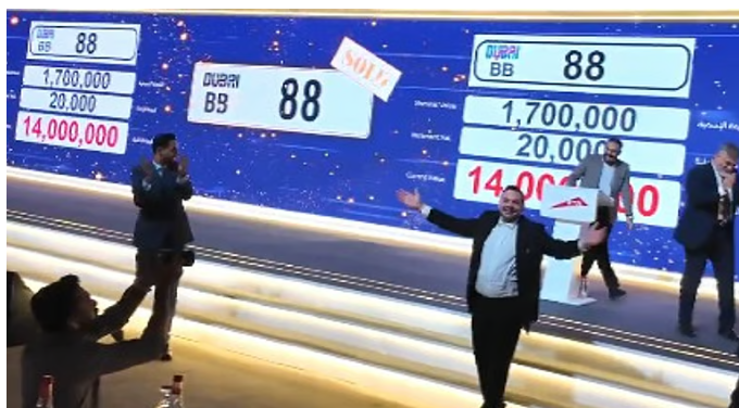 ദുബൈ: ദുബൈ റോഡ്സ് ആൻഡ് ട്രാൻസ്പോർട്ട് അതോറിറ്റി (ആർ ടി എ) സംഘടിപ്പിച്ച നമ്പർ പ്ലേറ്റ് ലേലത്തിൽ താരമായി ബി ബി 88 എന്ന നമ്പർ. അതി വാശിയേറിയ ലേലം വിളിക്ക് അവസാനം 14 മില്യൺ ദിർഹത്തിന് ആണ് നമ്പർ വിറ്റു പോയത്. അതായത് 34 കോടി ഇന്ത്യൻ രൂപ. ദുബൈ ഗ്രാൻഡ് ഹയാത്ത് ഹോട്ടലിൽ നടന്ന ലേലത്തിൽ അകെ 97.95 മില്യൺ ദിർഹത്തിനാണ് വിവിധ നമ്പർ പ്ലേറ്റുകൾ വിറ്റു പോയതെന്ന് അധികൃതർ വ്യക്തമാക്കി.