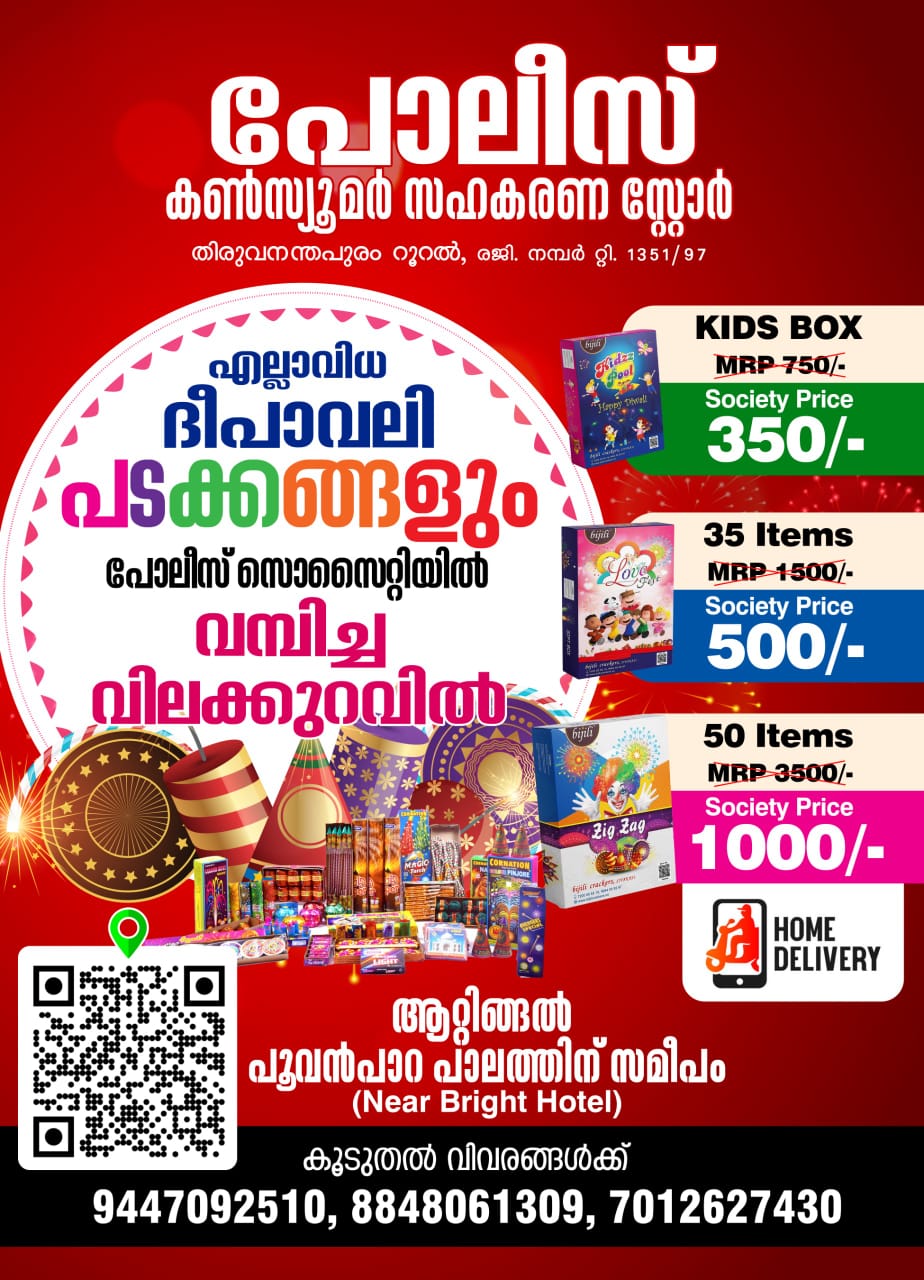 തിരുവനന്തപുരം റൂറൽ പോലീസ് കൺസ്യൂമർ സഹകരണ സ്റ്റോറിന്റെ ആഭിമുഖ്യത്തിൽ ദീപാവലി മഹോത്സവത്തോടനുബന്ധിച്ച് വമ്പിച്ച വിലക്കുറവിൽ ദീപാവലി പടക്ക ഉൽപ്പന്നങ്ങൾ ആറ്റിങ്ങൽ പൂവൻപാറ പാലത്തിന് സമീപം (Near bright hotel) പോലീസ് കൺസ്യൂമർ സൊസൈറ്റിയിൽ നിന്നും ലഭിക്കുന്നതാണ്.