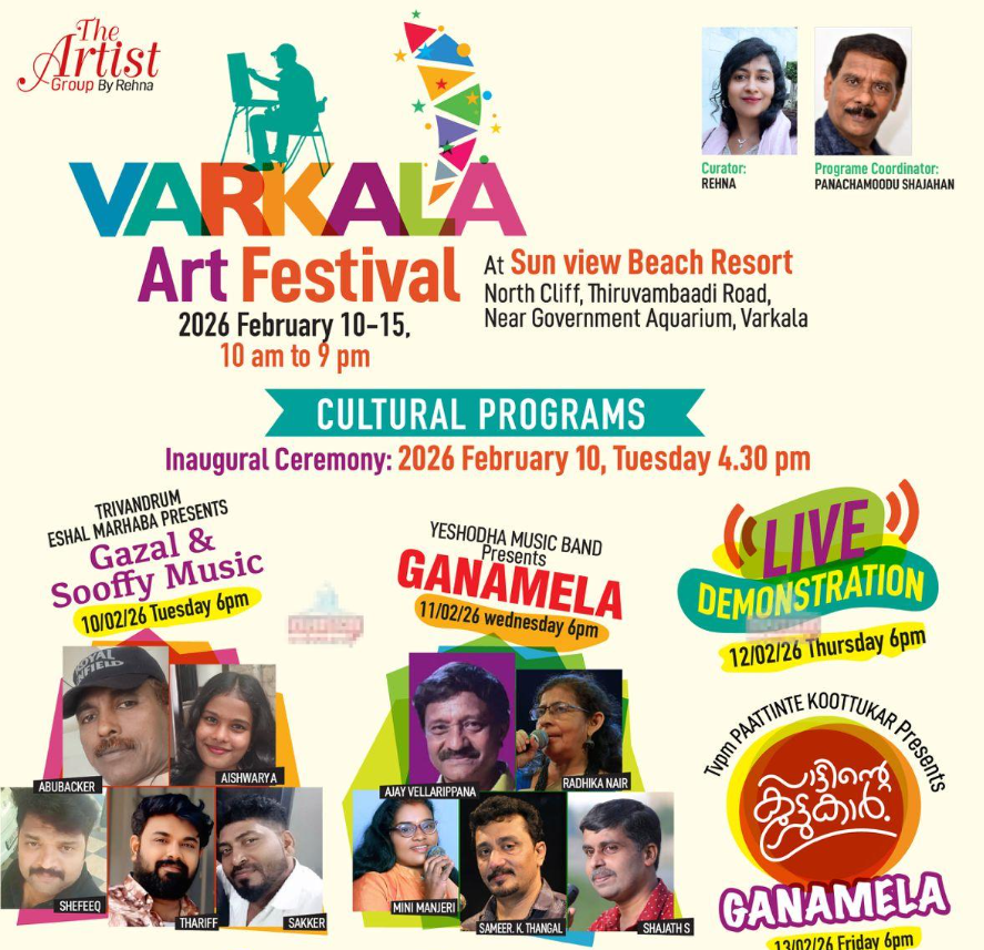 തിരു: ഫെബ്രുവരി 10 മുതൽ 15 വരെ വർക്കല ആർട്ട് ഫെസ്റ്റിവൽ വർക്കല ക്ലിഫിലെ സൺ വ്യൂ ബീച്ച് റിസോർട്ടിൽ നടക്കുന്ന വർക്കല 2026 കലാ മാമങ്കം കലാസ്നേഹികൾക്ക് വ്യത്യസ്തമായ അനുഭവം സമ്മാനിക്കാൻ ഒരുങ്ങുന്നു. ദി ആർട്ടിസ്റ്റ് ഗ്രൂപ്പ് – ബൈ രഹന സംഘടിപ്പിക്കുന്ന ഫെസ്റ്റിവൽ, ചിത്രകലയും സംസ്കാരവും ഒരുമിക്കുന്ന വേദിയാകുന്നു.