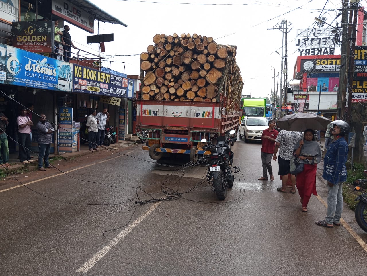ലൈനിൽ തട്ടി ലൈൻ പൊട്ടുകയും ഒരു ബൈക്കിനു മുകളിലൂടെ വീണു. ബൈക്കുകാരൻ അത്ഭുതകരമായി രക്ഷപ്പെടുകയായിരുന്നു. അമിത ലോഡ് ആയിരുന്നു ലോറിയിൽ.