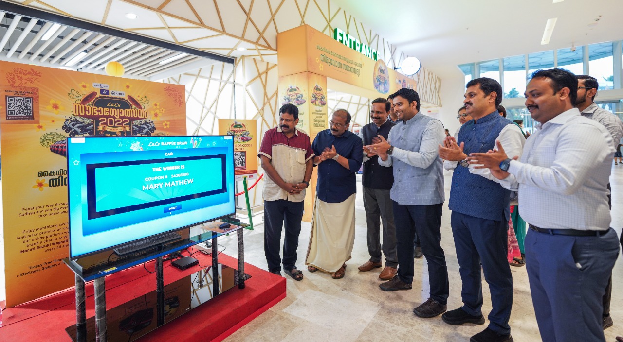 ലുലു ഓണം സൗഭാഗ്യോത്സവത്തിന്റെ ഭാഗമായുള്ള ആദ്യ വിജയിയെ തിരുവനന്തപുരം ചേംബർ ഓഫ് കൊമേഴ്സ് പ്രസിഡന്റ് എസ് എൻ രഘുചന്ദ്രൻ നായര് നറുക്കെടുക്കുന്നു. ലുലു ഗ്രൂപ്പ് റീജിയണല് ഡയറക്ടര് ജോയ് ഷഡാനന്ദന്, റീജിയണല് മാനേജര് അബ്ദുള് സലീം ഹസന്, ഹൈപ്പര്മാര്ക്കറ്റ് ജനറല് മാനേജര് രാജേഷ് ഇ വി എന്നിവര് സമീപം.