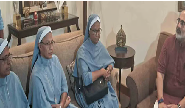 ഡല്‍ഹി: മനുഷ്യക്കടത്തും മതപരിവര്‍ത്തനവും ആരോപിക്കപ്പെട്ട് ഛത്തീസ്ഗഢില്‍ അറസ്റ്റിലായ കന്യാസ്ത്രീകള്‍ ബിജെപി സംസ്ഥാന അധ്യക്ഷന്‍ രാജീവ് ചന്ദ്രശേഖറുമായി കൂടിക്കാഴ്ച നടത്തി. ഡല്‍ഹിയിലെ വസതിയില്‍ എത്തിയാണ് സിസ്റ്റര്‍ പ്രീതി മേരി, സിസ്റ്റര്‍ വന്ദന ഫ്രാന്‍സിസ് എന്നിവര്‍ സഹോദരന് ഒപ്പം രാജീവ് ചന്ദ്രശേഖറിനെ കണ്ടത്.