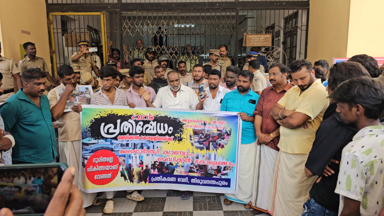 മെഡിക്കൽ കോളേജിലെ ദുരവസ്ഥക്കെതിരെ പ്രതികരണ വേദിയുടെ നേതൃത്വത്തിൽ മെഡിക്കൽ കോളേജ് പ്രിൻസിപ്പൽ ഓഫീസിലേക്ക് വൻ പ്രതിഷേധം. പാവപ്പെട്ട രോഗികളുടെ ഏക ആശ്രയകേന്ദ്രമായ മെഡിക്കൽ കോളേജിലെ ദുരവസ്ഥക്കെതിരെ മെഡിക്കൽ കോളേജ് പ്രിൻസിപ്പൽ ഓഫീസിലേക്ക് മാർച്ച് നടത്തി. തലസ്ഥാനനഗരിയിലെ ആരോഗ്യം കാക്കുന്ന ഈ ആതുരാലയത്തിൽ ചികിത്സയ്ക്കായി എത്തുന്നവർക് ആവശ്യമായ ചികിത്സ ലഭിക്കുന്നില്ല. 14 ലും ഇരുപത്തി ഏഴിലും, 28 ലും വാർഡുകളിൽ അഡ്മിറ്റ് ആകുന്ന രോഗികളെ ബെഡിൽ കിടത്തി ചികിത്സിക്കുവാനുള്ള സൗകര്യം പോലുമില്ല. ഈ ദുരവസ്ഥക്കെതിരെയാണ് വൻ പ്രതിഷേധവുമായി പ്രതികരണവേദി പ്രവർത്തകർ പ്രിൻസിപ്പൽ ഓഫീസിനു മുന്നിലെത്തിയിരിക്കുന്നത്.