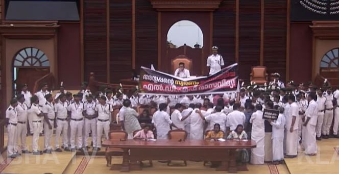 സഭയിൽ പ്രതിപക്ഷം തെമ്മാടിത്തരമാണ് കാണിക്കുന്നതെന്ന് സിപിഎമ്മിലെ എം രാജഗോപാൽ പറഞ്ഞു. സഭയുടെ നടപടിക്രമം അനുസരിച്ച് ചെയറിനെ നോക്കി സംസാരിക്കണമെന്നാണ് പറയുന്നത്. അതിനാൽ ബാനർ ഇങ്ങനെ പിടിച്ചിരിക്കുന്നത് തെറ്റാണ്. അതു മാറ്റാൻ നിർദേശം നൽകണമെന്ന് മന്ത്രി കെ ബി ഗണേഷ് കുമാർ സ്പീക്കറോട് ആവശ്യപ്പെട്ടു. ഇതിനിടെ, മുഖ്യമന്ത്രി പ്രതിപക്ഷ അംഗത്തിനു നേരെ നടത്തിയ ദേഹനിന്ദാ പ്രയോഗം പ്രതിപക്ഷ നേതാവ് വിഡി സതീശൻ നിയമസഭയിൽ ഉന്നയിച്ചു. ഇക്കാര്യം സീറോ അവറിൽ ഉന്നയിക്കാമെന്ന് സ്പീക്കർ പറഞ്ഞു.